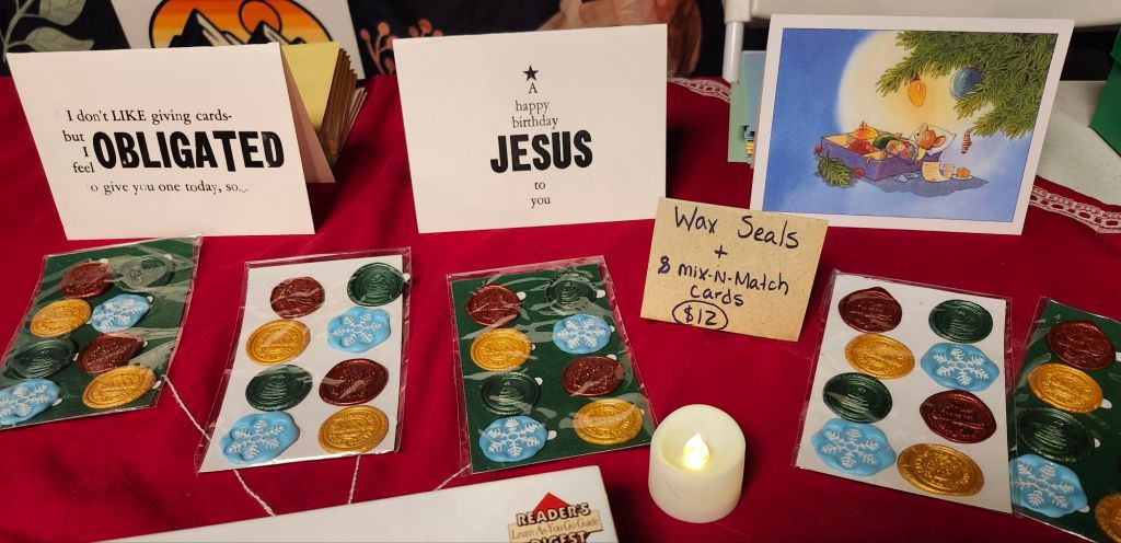 Stop by for a mini collection of books, holiday cards and wax seals, and a bowmaking station! Today from 10AM-1PM.